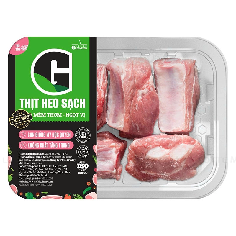 Sườn Già Heo Cắt Khúc G Kitchen được đóng khay nhựa chuyên dụng với màng bọc trong suốt, giúp dễ dàng quan sát và kiểm tra chất lượng thịt bên trong.