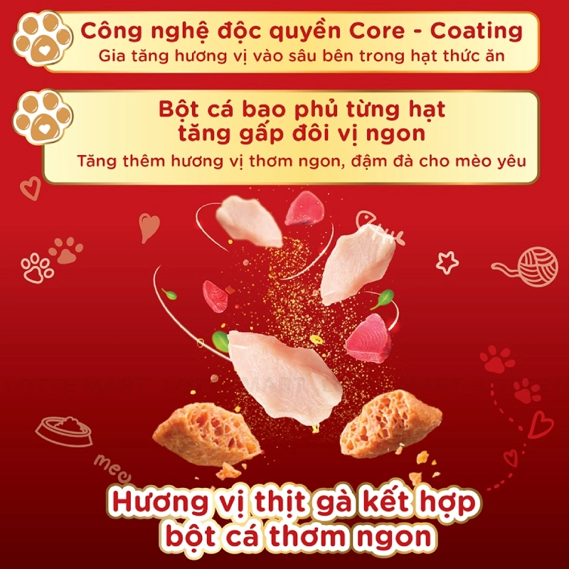 - Công nghệ độc quyền Core - Coating gia tăng hương vị vào sâu bên trong hạt thức ăn.