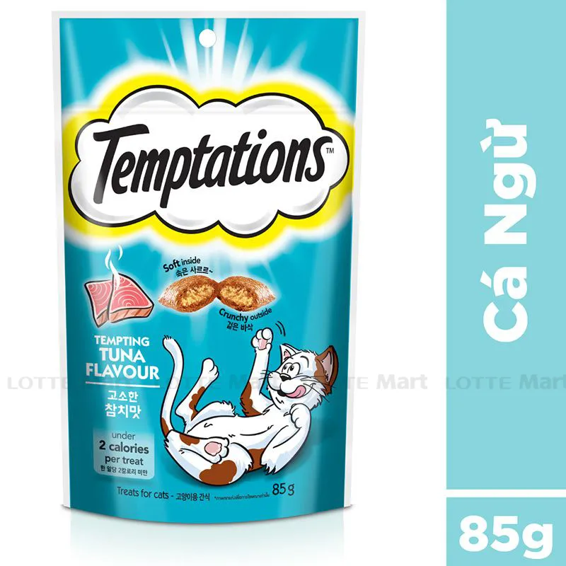 Bánh thưởng cho mèo Temptations hương cá ngừ vị thơm ngon, giòn tan bên ngoài và siêu mềm khó cưỡng bên trong. Có nhiều vị đa dạng như gà, sữa, cá hồi, hải sản và cá ngừ. Mỗi viên không quá 2Kcal. Sản phẩm không màu thực phẩm.
