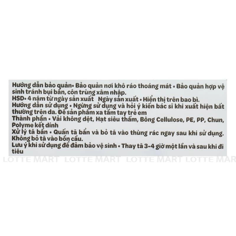 Hướng dẫn sử dụng: Luồn tã vào từng chân bé rồi kéo lên, điều chỉnh lưng thun và đùi vừa vặn với bé, tránh mép chun bị gập vào trong. Để thay tã, xé hai bên hông và miếng tã ra, cuộn tròn tã lại và cho vào thùng rác.