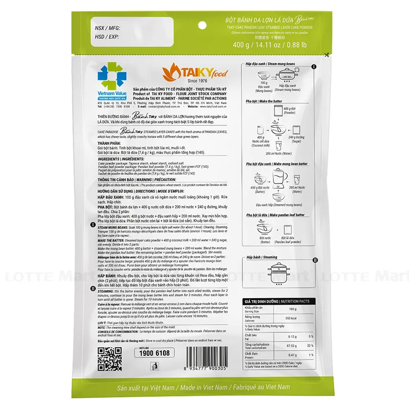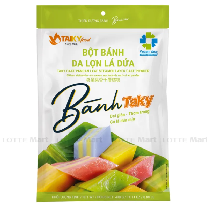 - Bột Làm Bánh Da Lợn Lá Dứa Taky 400g dễ pha chế, cho những người không có thời gian hay khéo tay cũng có thể làm được. Bột bánh Tài Ký là thương hiệu lớn, an toàn và chất lượng được tin dùng.