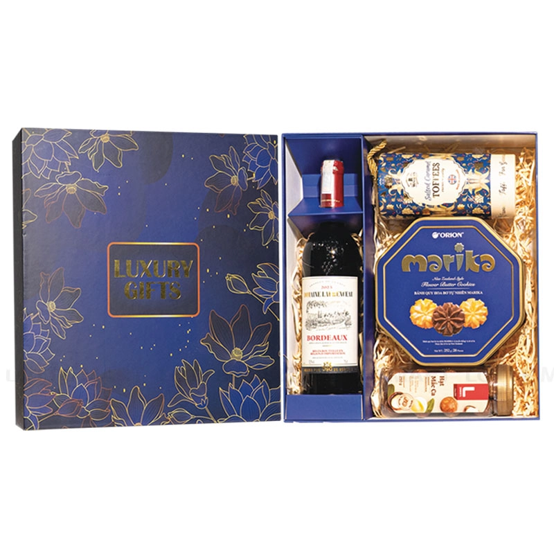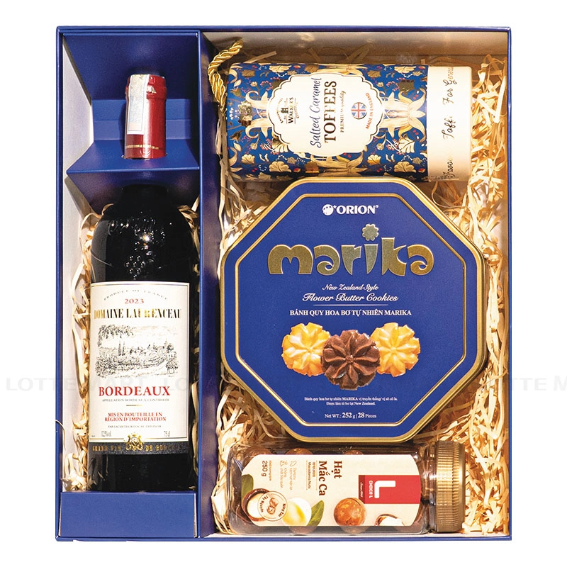 Sự kết hợp giữa rượu vang Bordeaux cao cấp, bánh quy bơ hộp thiếc và kẹo caramel nhập khẩu cùng hạt mắc ca tạo nên hương vị tinh tế cho những ngày Tết. Hộp quà được thiết kế tông xanh tím quý phái, thể hiện sự trân trọng và giá trị của người tặng.