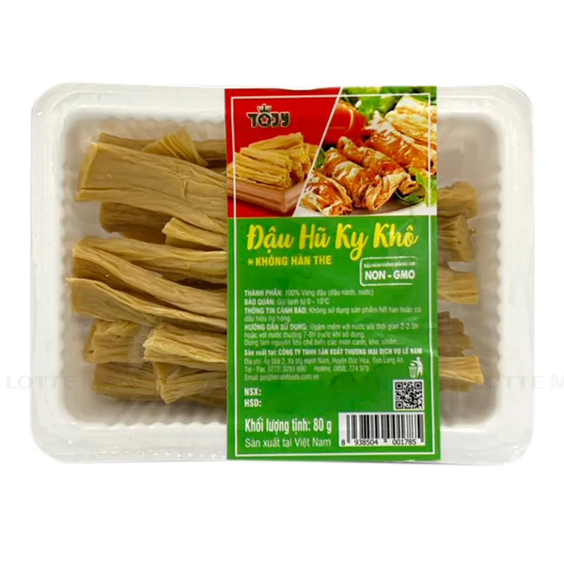 - Tàu Hủ Ky Tojy 80G được chế biến từ đậu nành. Trong quá trình nấu đậu nành, một lớp đậu mỏng chứa đạm và chất béo sẽ hình thành trên bề mặt nồi sữa đậu. Người ta sẽ vớt lớp màng mỏng này và phơi khô để thành tàu hũ ky.