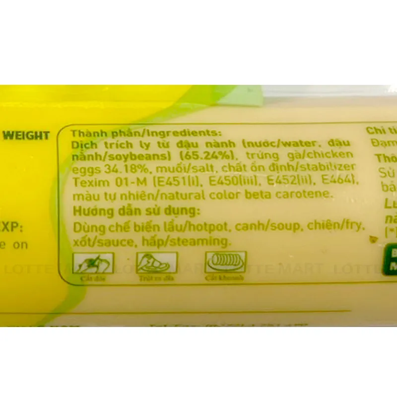 - Sữa đậu nành (đậu nành, nước), trứng gà 30%, muối, chất ổn định (452i), màu tự nhiên beta-caroten.