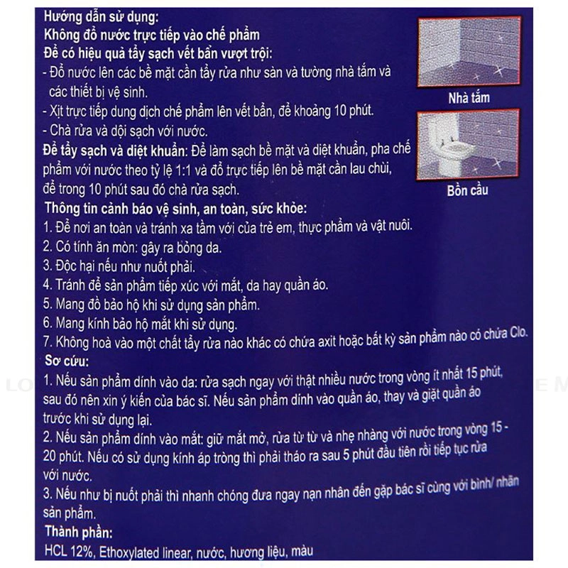 Thành phần: HCL 12%, Ethoxylated Linear, Nước, Hương liệu, Màu.