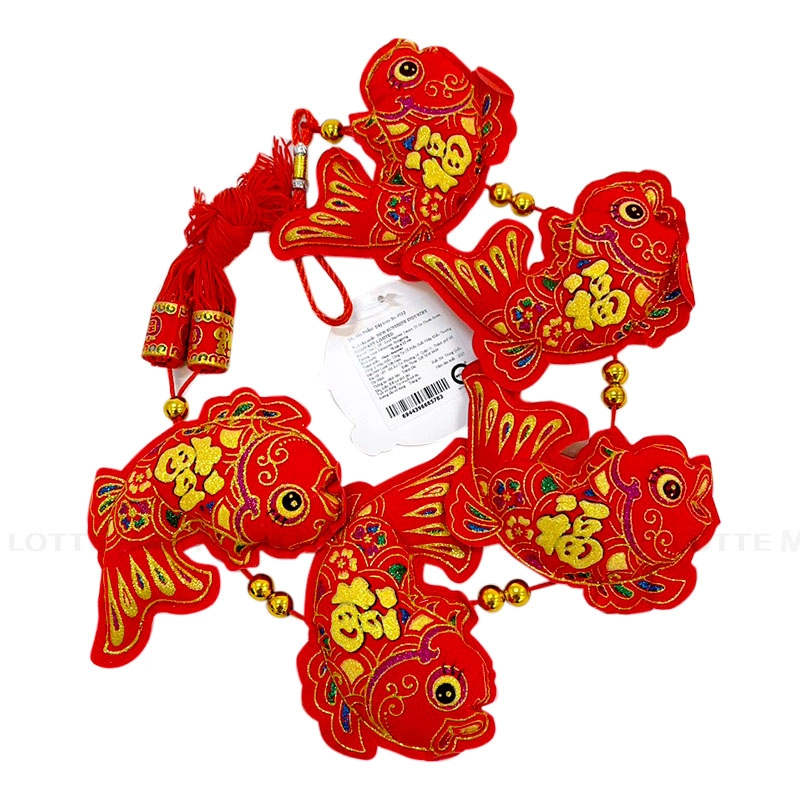 - Chuỗi cá được liên kết bằng hạt trang trí nhỏ, phía dưới có tua rua đỏ mềm mại giúp tổng thể thêm sinh động, mang ý nghĩa dư dả, tài lộc và hanh thông (cá chép tượng trưng cho “dư”, thuận lợi và may mắn trong năm mới).