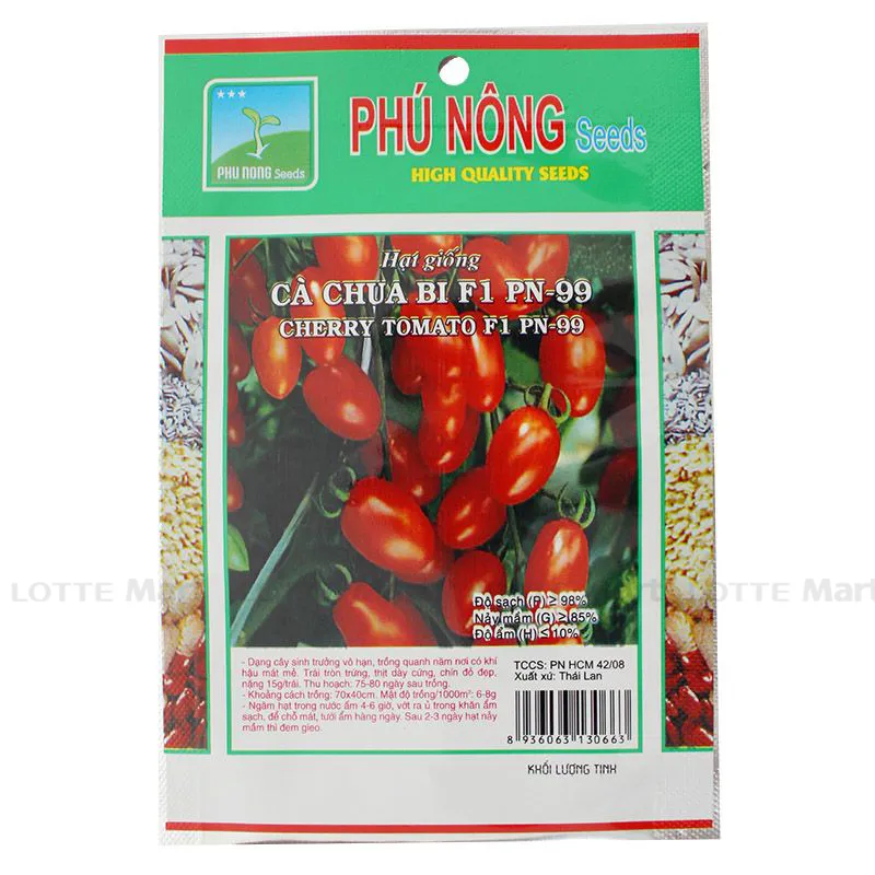 Hạt giống cà chua bi Thái Lan Phú Nông được sản xuất và sàng lọc trong điều kiện tốt để đạt chất lượng cao, là sản phẩm hạt giống được tuyển chọn từ những cây giống tốt cho khả năng thu hoạch nhanh. Sản phẩm không dùng hóa chất bảo quản và có nguồn gốc rõ ràng, là hạt giống tốt thích hợp gieo trồng trên đất ẩm.