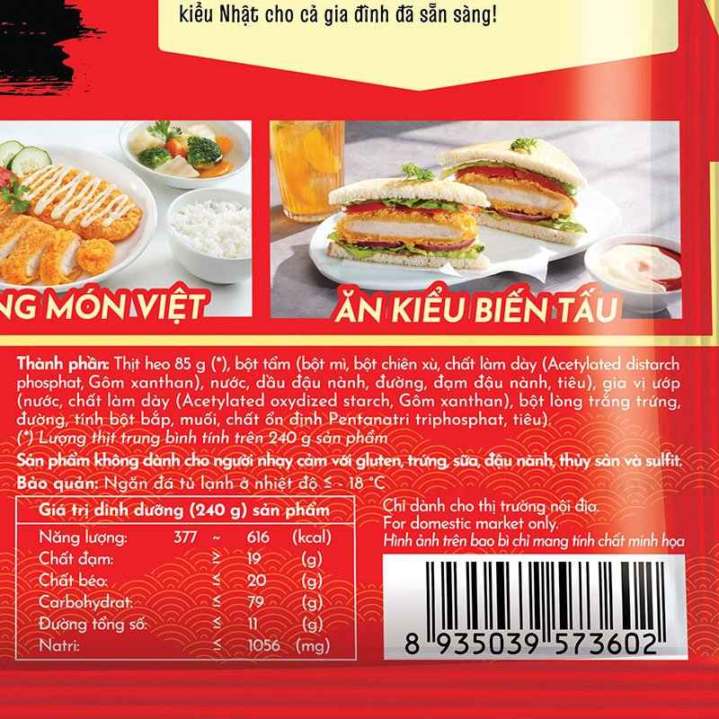 - Thịt heo 85g, bột tẩm (bột mì, bột chiên xù, chất làm dày (Acetylated distarch phosphat, Gôm xanthan), nước, dầu đậu nành, đường, đạm đậu nành, tiêu), gia vị ướp đường, tinh bột bắp, muối, chất ổn định Pentanatri triphosphat, tiêu)