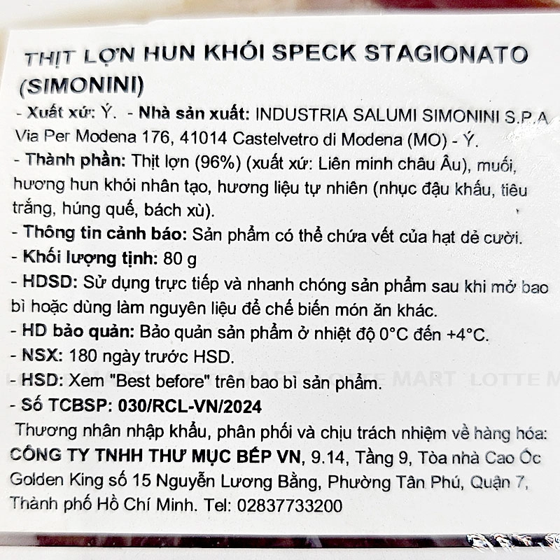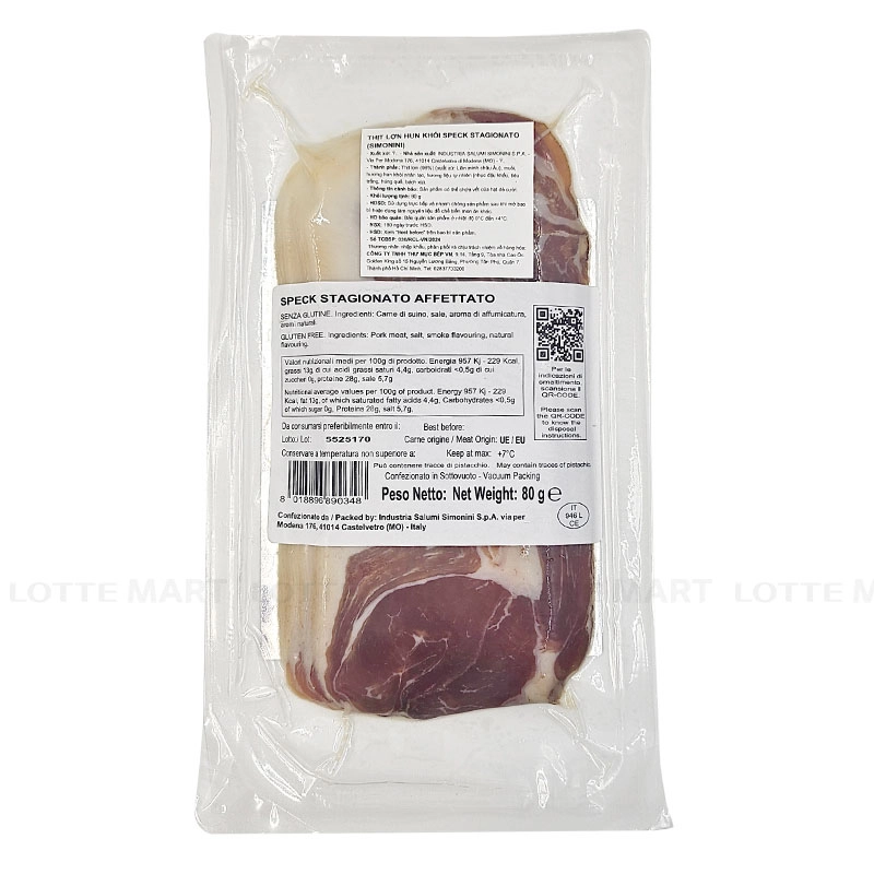 - Speck Stagionato Simonini là món thịt heo muối hun khói tinh tế, mang đậm phong cách truyền thống Ý, được chế biến bởi thương hiệu Simonini - nổi tiếng với các sản phẩm thịt nguội cao cấp.