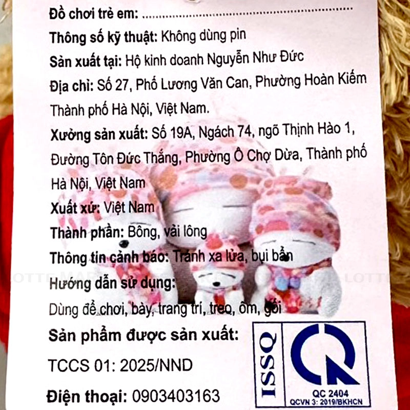 - Lớp bông mượt, mềm mịn, rất êm ái khi ôm chơi hoặc ngủ. Phần bông bên trong được nhồi đầy đặn, hạn chế xẹp khi sử dụng. Từng đường may được gia công tỉ mỉ, chắc chắn.