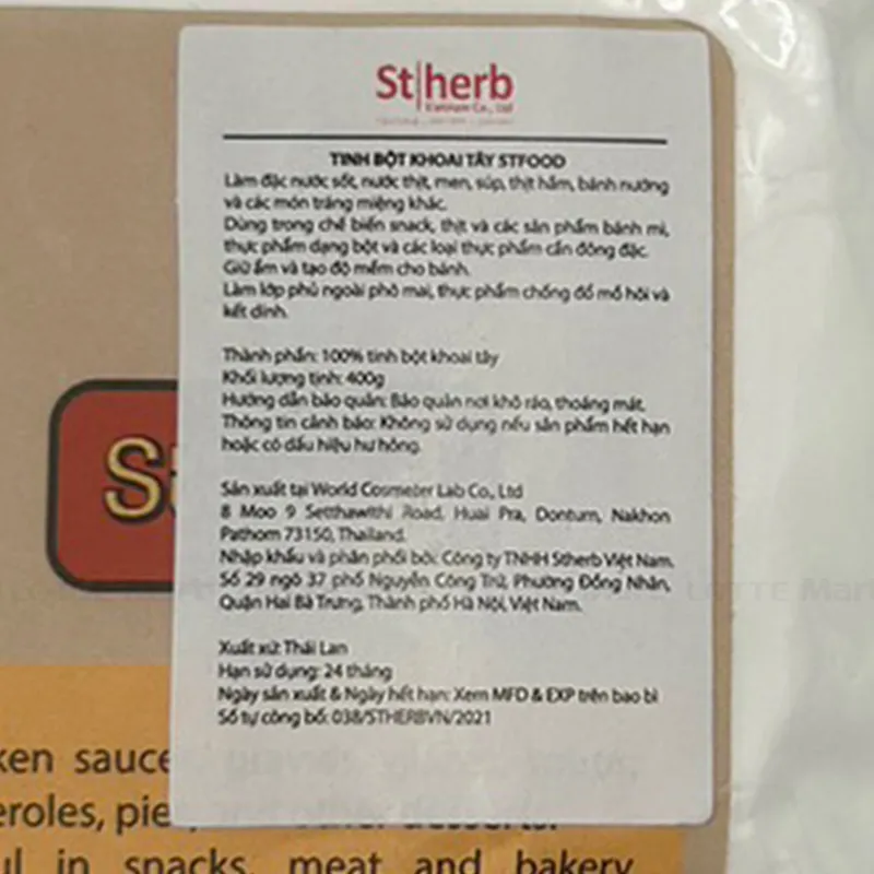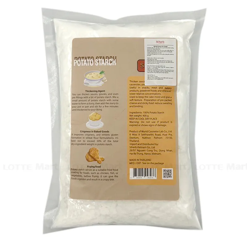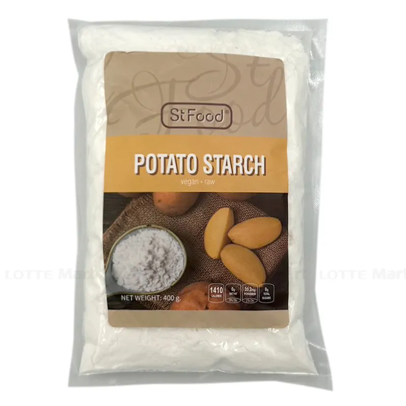 - Tinh Bột Khoai Tây ST Food Gói 400G là dạng bột được chế biến từ 100% khoai tây tự nhiên thường được ứng dụng trong nấu ăn và làm bánh, được biết đến như là một nguyên liệu để làm vỏ há cảo, bột áo bánh mochi, chế biến các món ăn như súp, thịt hầm, nước sốt, chiên rán,…