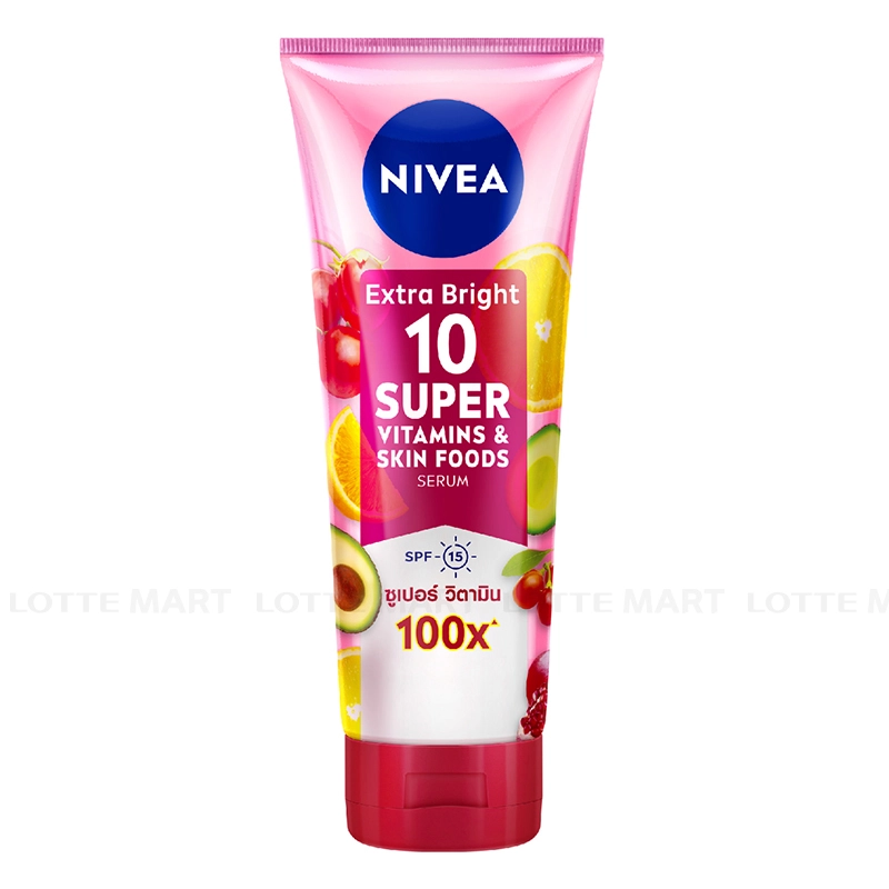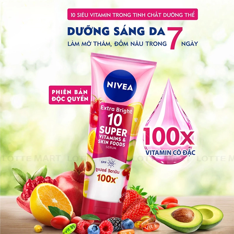 Tinh Chất Dưỡng Thể Nivea Sáng Da Extra Bright 10 Super Vitamin SPF15 Chai 180ml chứa 100 lần Vitamin A và các thành phần chống oxy hóa để phục hồi và tái tạo làn da, mang đến làn da trẻ trung khỏe mạnh rạng rỡ trong 7 ngày.