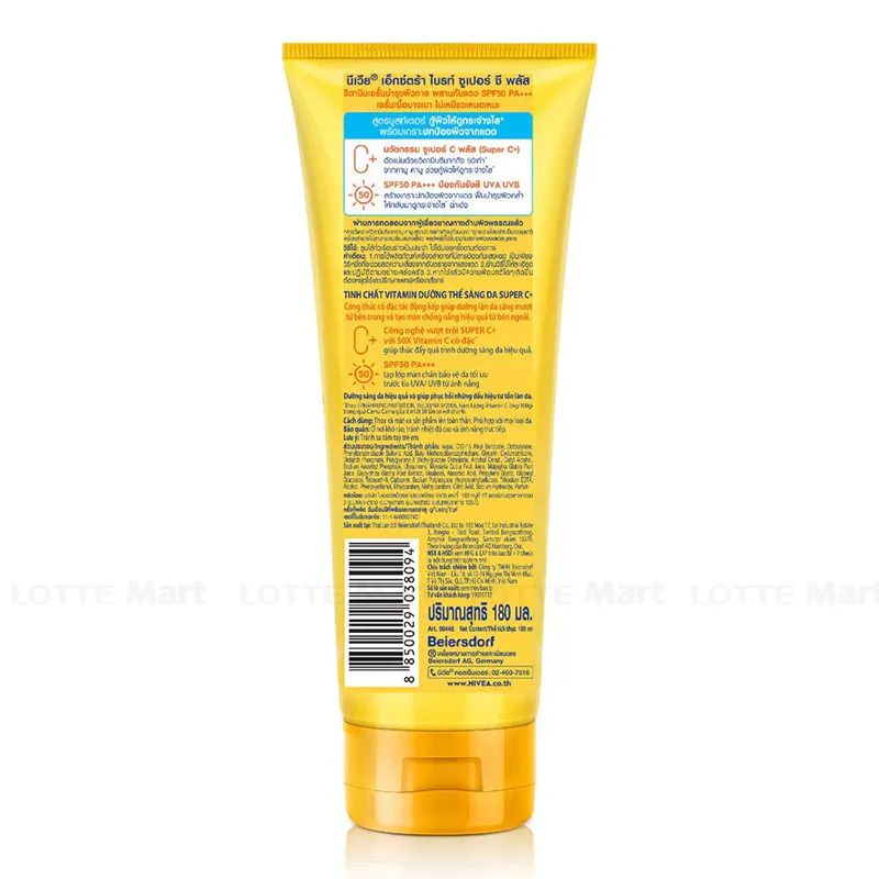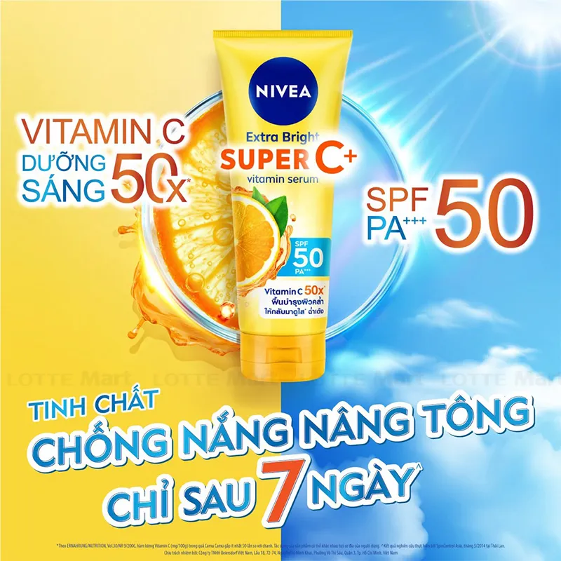 - Tinh Chất Dưỡng Thể Nivea Vitamin Super C+ Sáng Da SPF50/PA+++ 180ml công thức cô đặc tác động kép giúp dưỡng làn da sáng mượt từ bên trong và tạo màng chống nắng hiệu quả từ bên ngoài.