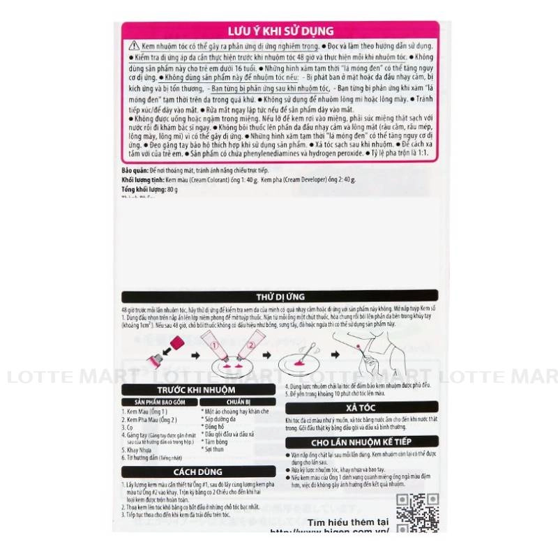 Lưu ý: kiểm tra dị ứng trên da trước khi nhuộm tóc 48 giờ. Không dùng sản phẩm này cho trẻ em dưới 16 tuổi. Không sử dụng để nhuộm lông mi hoặc lông mày. Tránh tiếp xúc/để dây vào mắt. HDBQ: Bảo quản nơi thoáng mát. Tránh ánh nắng trực tiếp và nơi có nhiệt độ cao. Xuất xứ: Nhật Bản.