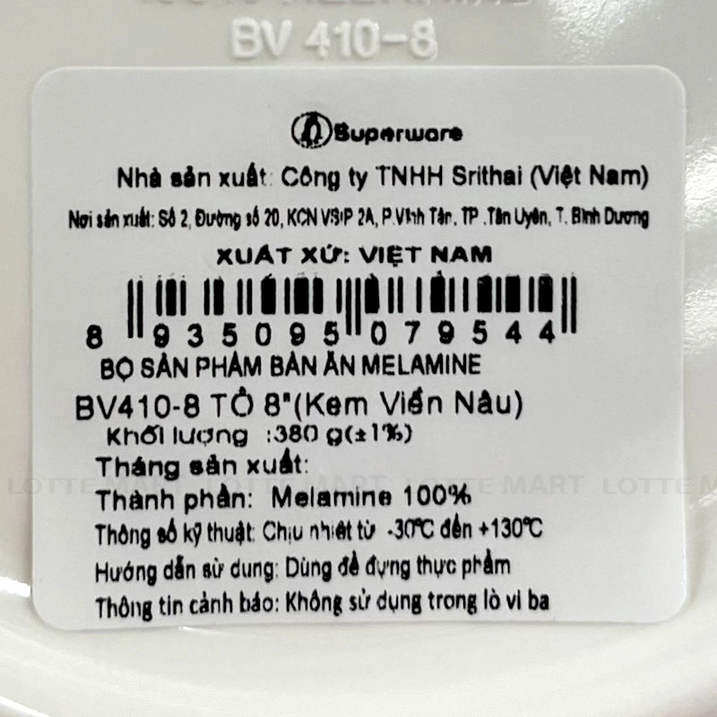 Tô Tròn Melamine Superware Viền Nâu BV410 20cm được làm từ 100% chất liệu melamine, mang độ bền, an toàn khi sử dụng.