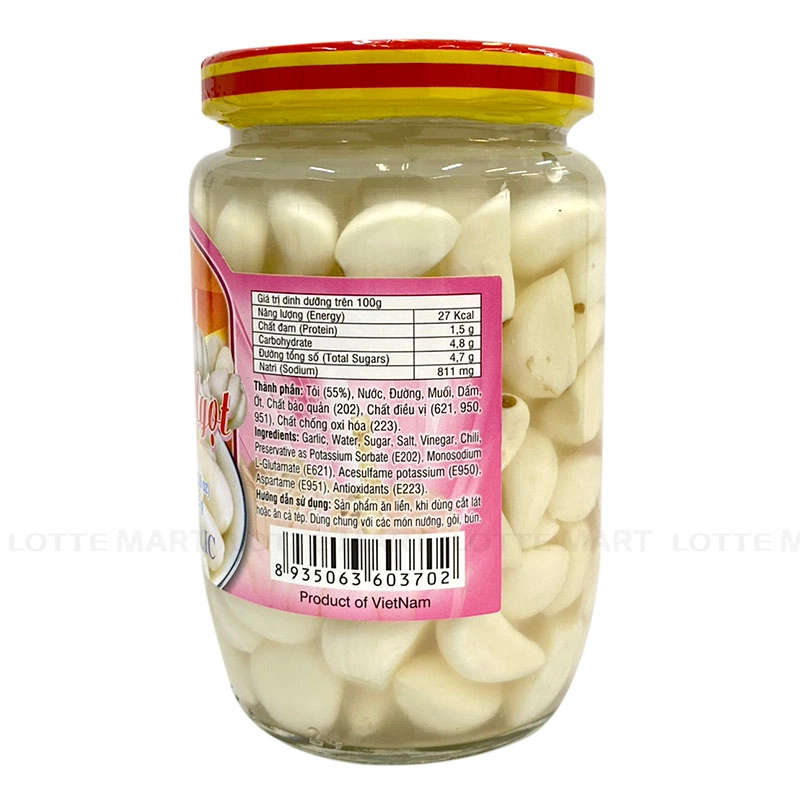 Tỏi chứa nhiều chất chống oxy hóa, có lợi cho sức khỏe. Bên cạnh đó, tỏi còn là nguồn chứa allicin, hỗ trợ hệ miễn dịch của cơ thể hiệu quả. Tỏi chua ngọt Ngọc Liên được sản xuất hoàn toàn khép kín, bảo đảm an toàn vệ sinh thực phẩm. Từng nguyên liệu được tuyển chọn kỹ lưỡng, cho chất lượng nổi bật và không chứa chất độc hại cho người dùng. Chỉ cần một vài lát tỏi món ăn của bạn sẽ thêm phần thơm ngon, hấp dẫn, kích thước vị giác của bạn. Tỏi chua ngọt Ngọc Liên được chế biến sẵn và đóng lọ, giúp bạn tiết kiệm thời gian và công sức. Sản phẩm là loại món ăn chua ngọt không thể thiếu trong gian bếp của mỗi gia đình. Thành phần: Tỏi, nước, đường, muối, dấm, ớt, chất bảo quản (E202, E211). Sử dụng: Dùng ăn liền, ăn cắt lát hoặc cả tép. Bảo quản: Bảo quản nơi thoáng mát, tránh ánh nắng mặt trời.