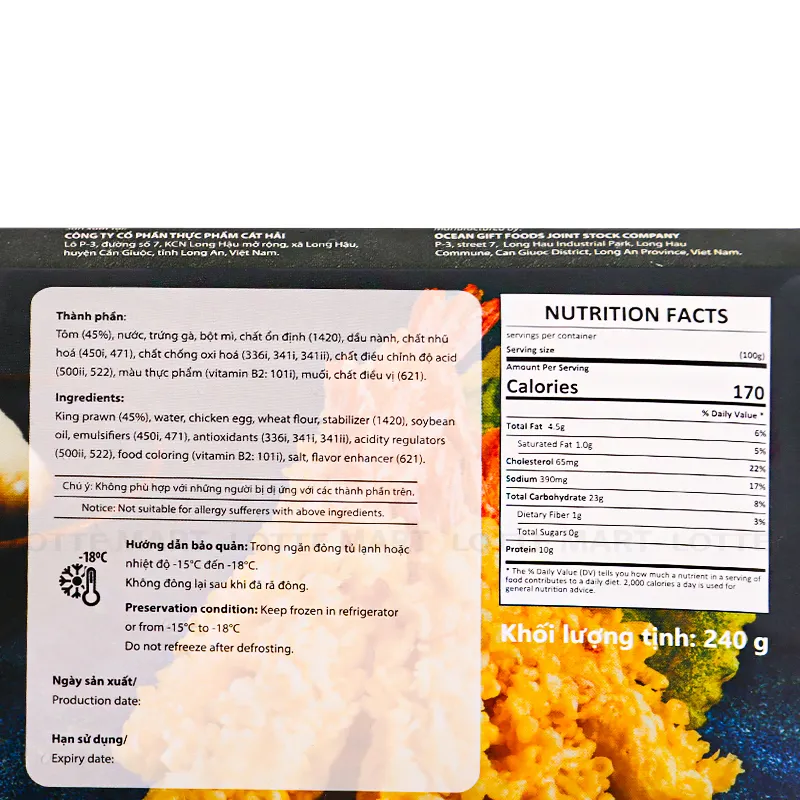 Tôm tempura là một loại thực phẩm chiên của người Nhật, được làm từ những con tôm tươi mọng nước tráng qua lớp bột mỏng và chiên ngập dầu cho đến khi vỏ bột trở nên vàng giòn. Hàm lượng calorie trong tôm tempura chứa 210 calo. Hàm lượng protein trong tôm tempura là 12g, carbohydrat 19 g, cholesterol 70mg và cung cấp 9g chất béo. Chỉ với sản phẩm bạn có ngay lập tức bữa ăn dinh dưỡng cùng gia đình, có thể dùng kèm với món cơm, món mì hoặc cho trẻ ăn vặt đều phù hợp. Chỉ cần mở bao bì, không rã đông cho vào ngập dầu chiên giòn là đã có món ăn ngon hấp dẫn. Tôm Tempura thường được dùng như một món snack đơn giản có thể chấm kèm với nước sốt tempura kiểu Nhật. Ngày nay, tôm tempura du nhập vào nhiều quốc gia khác nhau, mỗi nước sẽ có nhiều biến tấu phù hợp với văn hóa ẩm thực đặc trưng nên có nhiều loại nước sốt dùng kèm với tôm tempura như sốt chanh dây, sốt cam, sốt phô mai, sốt ớt ngọt, sốt chua ngọt….
