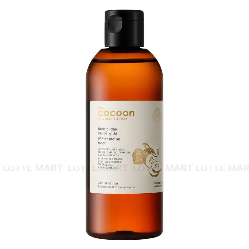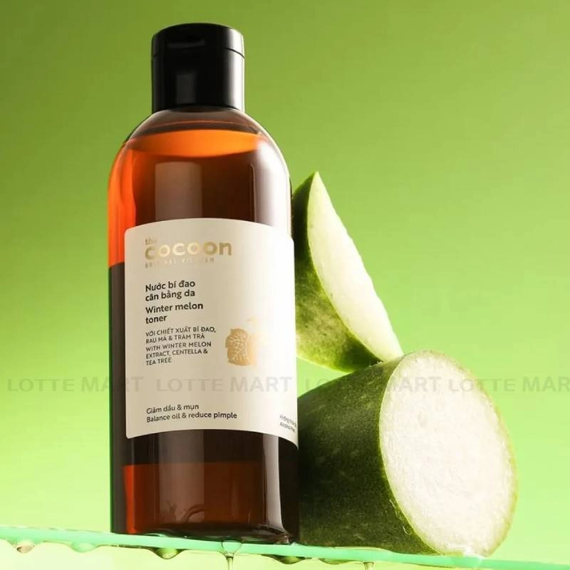 - Nước Cân Bằng Da Cocoon Chiết Xuất Bí Đao Giảm Mụn và Dầu là sản phẩm đến từ thương hiệu mỹ phẩm thuần chay Cocoon, với công thức không chứa cồn cùng thành phần giàu các chiết xuất tự nhiên như bí đao, rau má và tinh dầu tràm trà giúp cân bằng độ pH cho da, làm sạch sâu lỗ chân lông, giảm dầu thừa và mụn ẩn dưới da hiệu quả.