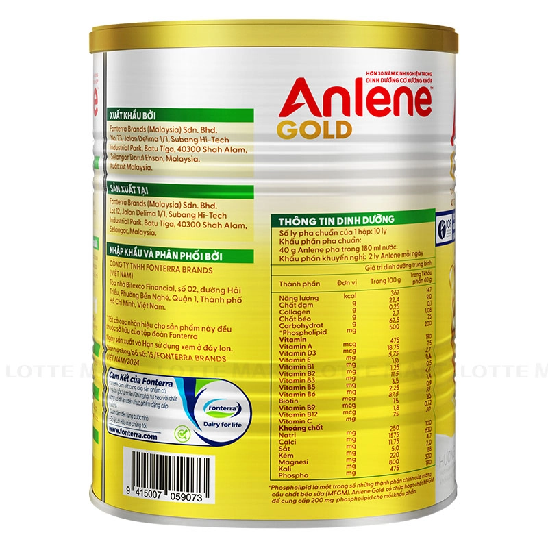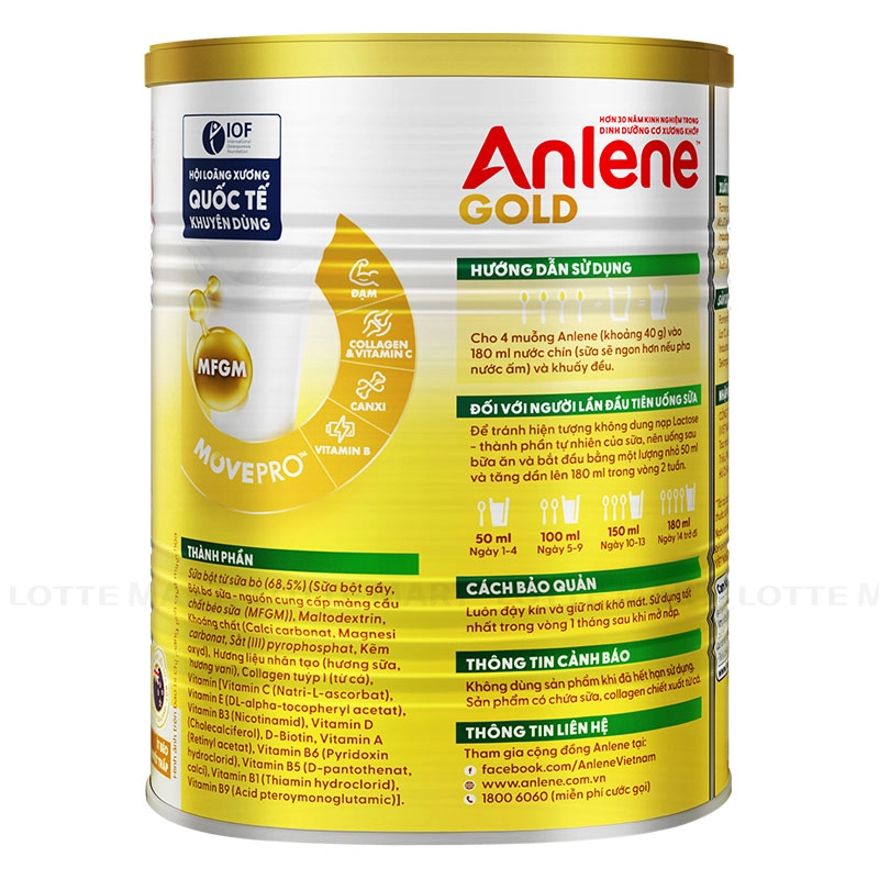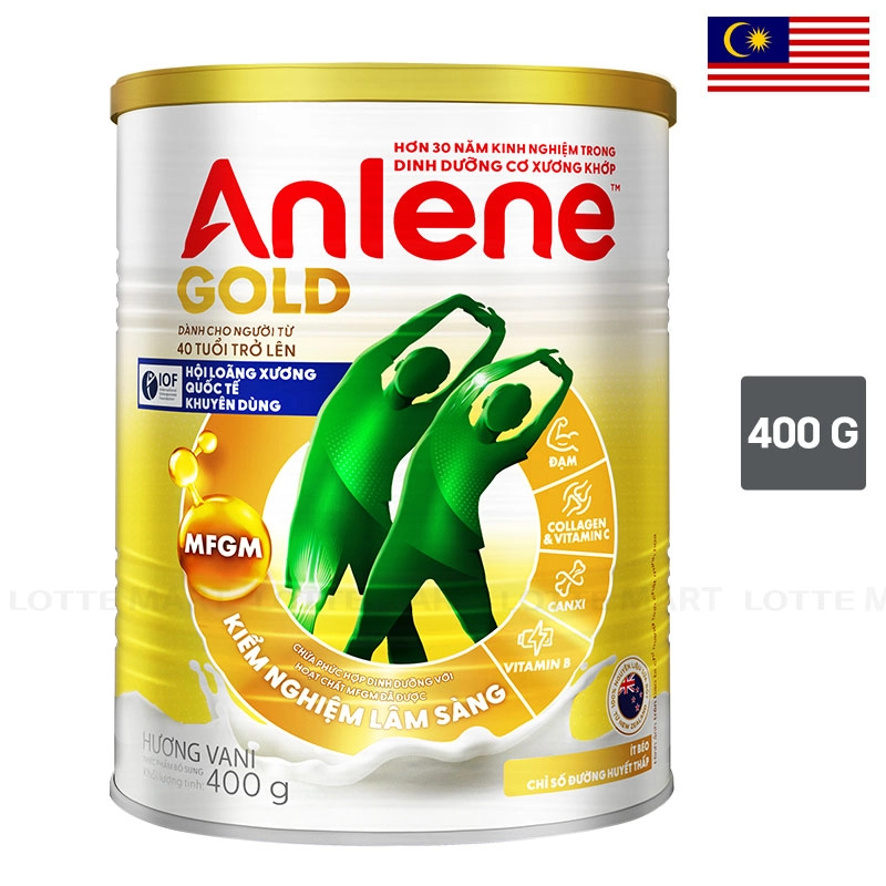 - Anlene Gold cung cấp đạm chất lượng cao, canxi, vitamin D, MFGM, collagen và các vitamin nhóm B, giúp duy trì và phát triển cơ bắp, xương chắc khỏe, khớp linh hoạt và tăng năng lượng cho cơ thể.