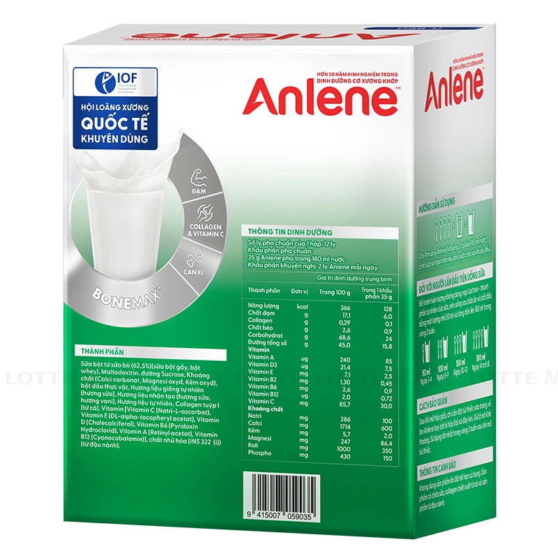 - Anlene Bonemax với hệ dưỡng chất BONEMAX™ cung cấp canxi, vitamin D, đạm chất lượng cao, collagen và vitamin C, giúp xương chắc khỏe, khớp linh hoạt và duy trì khối cơ.