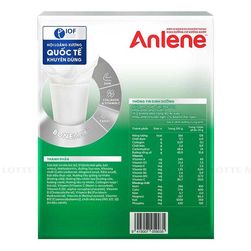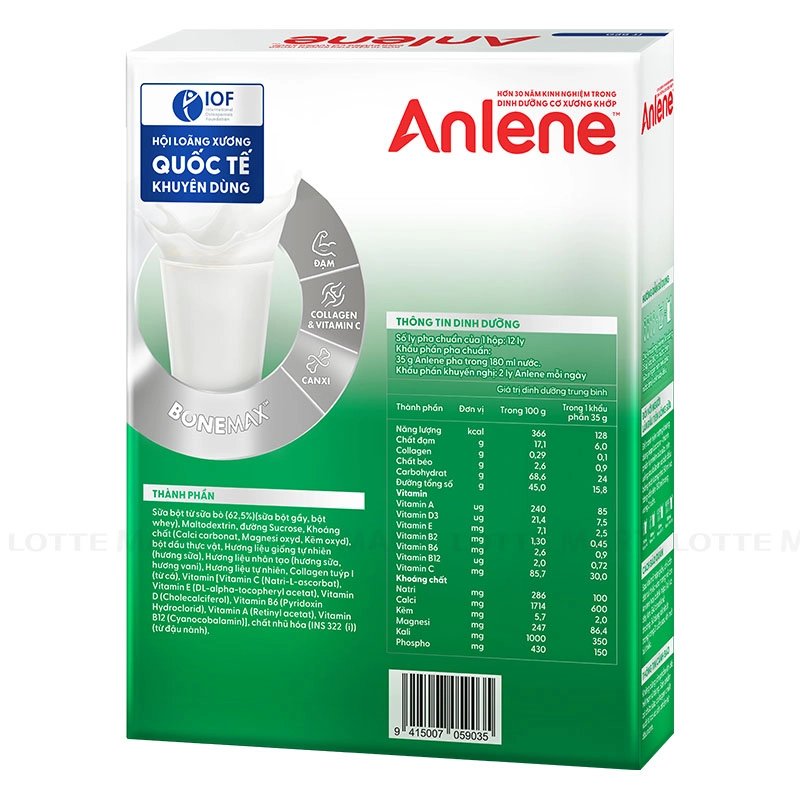 - Anlene Bonemax với hệ dưỡng chất BONEMAX™ cung cấp canxi, vitamin D, đạm chất lượng cao, collagen và vitamin C, giúp xương chắc khỏe, khớp linh hoạt và duy trì khối cơ.
