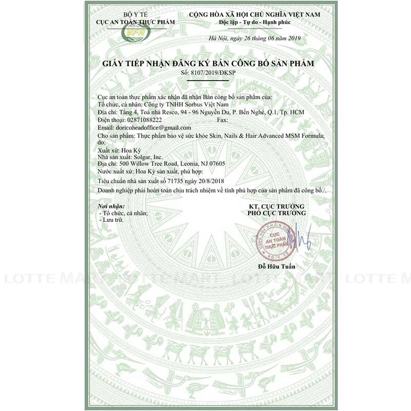 - Viên Uống Bảo Vệ Sức Khỏe Solgar Skin, Nails & Hair Advanced MSM Formula Lọ 60 Viên là sản phẩm đến từ Hoa kỳ thuộc thương hiệu vitamin cao cấp Solgar có công thức 4 in 1 với 4 tác dụng kép.