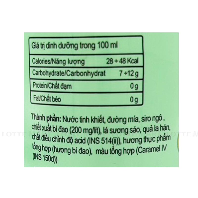 - Nước tinh khiết, đường mía, siro ngô, chiết xuất bí đao (200mg/l), lá sương sáo, quả la hán, chất điều chỉnh độ acid (INS 541 (ii), hương thực phẩm tổng hợp (hương bí đao),...