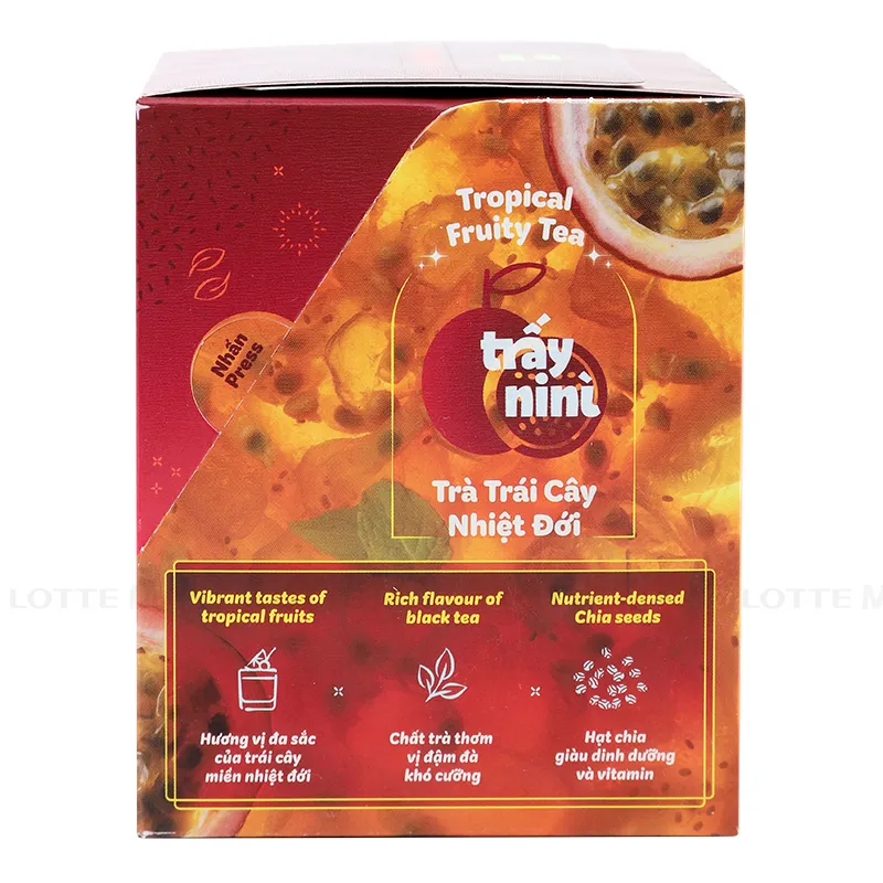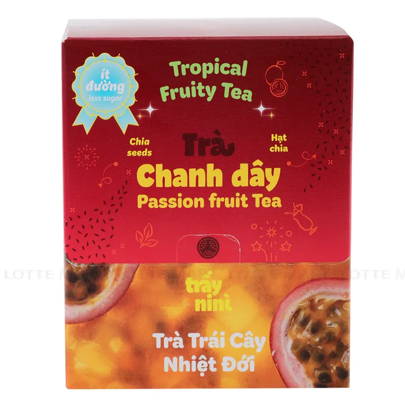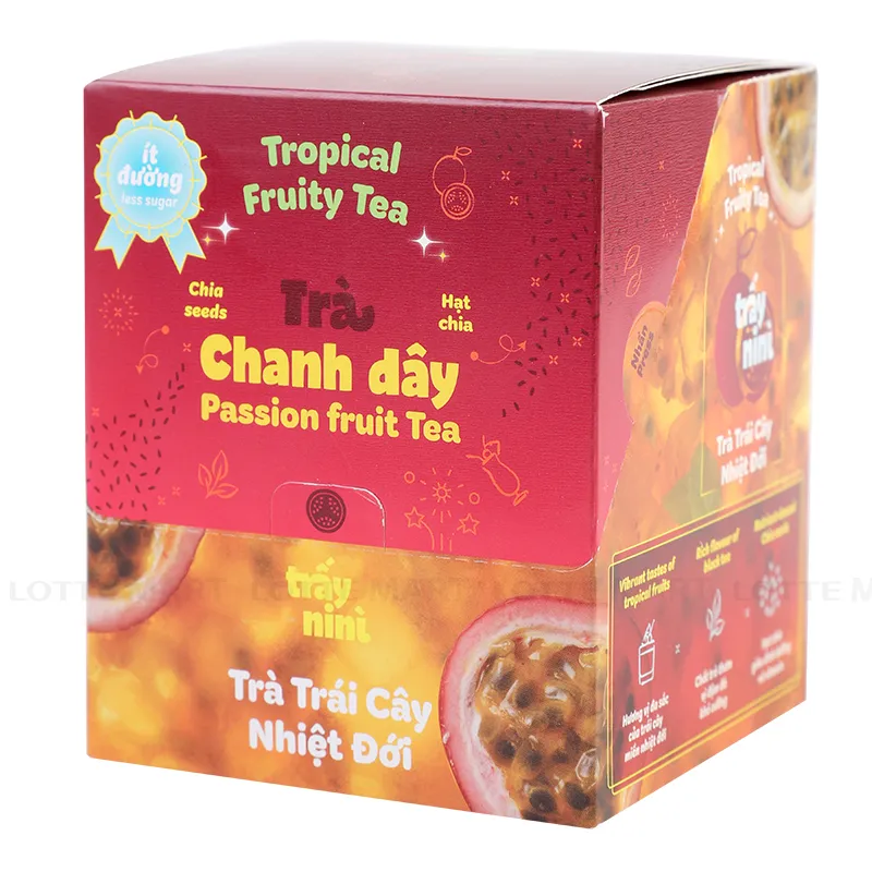 - Trà chanh dây được đóng hộp với nhiều gói nhỏ dạng bột hòa tan, tiện lợi khi pha chế, thật đơn giản để thưởng thức một tách trà ngon đúng điệu, cho cả ngày dài sảng khoái. Sản phẩm cũng thích hợp làm quà tặng bạn bè, người thân trong những dịp lễ Tết.