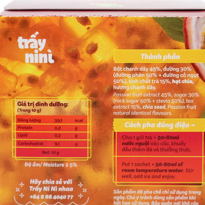 - Bột chanh dây 45%, đường 30%(đường cỏ ngọt 50% + đường phèn 50%), hạt chia,tinh chất trà 15%, hương chanh dây.