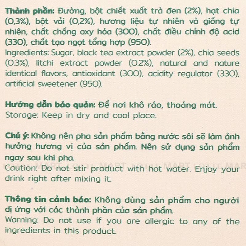 Thành phần: Đường, bột chiết xuất trà đen, hạt chia, bột vải, hương liệu tự nhiên và giống tự nhiên, chất chống oxy hóa, chất điều chỉnh độ acid, chất tạo ngọt tổng hợp.