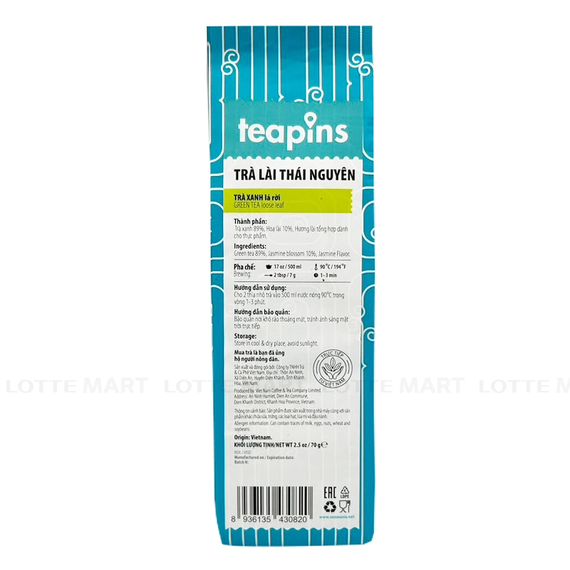 - Trà Lài Thái Nguyên Teapins Gói 70G được sản xuất từ trà xanh lá rời được gieo trồng ở thái nguyên kết hợp cùng hoa nhài, hương nhài tổng hợp dành cho thực phẩm. Trà lài Thái Nguyên Teapins được chọn lựa kỹ lưỡng theo tiêu chuẩn trà sạch xuất khẩu Châu Âu.