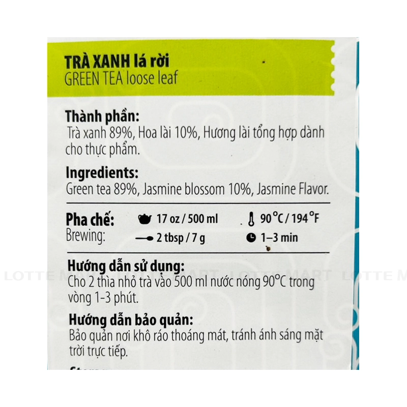 - Trà xanh 89%, hoa lài 100%, hương lài tổng hợp dành cho thực phẩm.