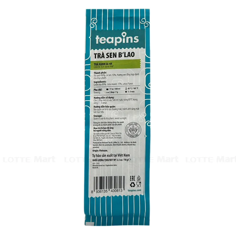 - Trà Sen B'Lao Teapins là sự kết hợp hài hòa giữa trà xanh cùng hương thơm tươi mát của hoa sen, giúp tách trà thêm thanh dịu đậm chất hương vị Việt Nam. Trà xanh Việt Nam thơm hương tươi mát của hoa sen. Một tách trà sẽ mang đến cho bạn hương vị Á Đông tuyệt vời nhất, trọn vẹn.