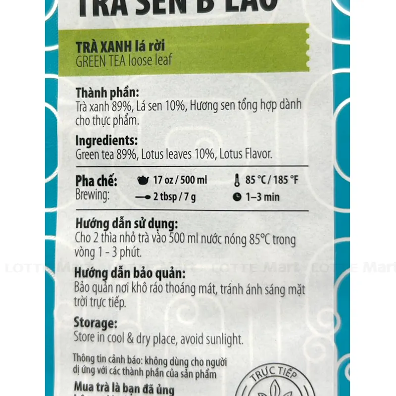 - Trà xanh lá rời 89%, lá sen 10%, hương sen tổng hợp dành cho thực phẩm, trà không chứa gluten.