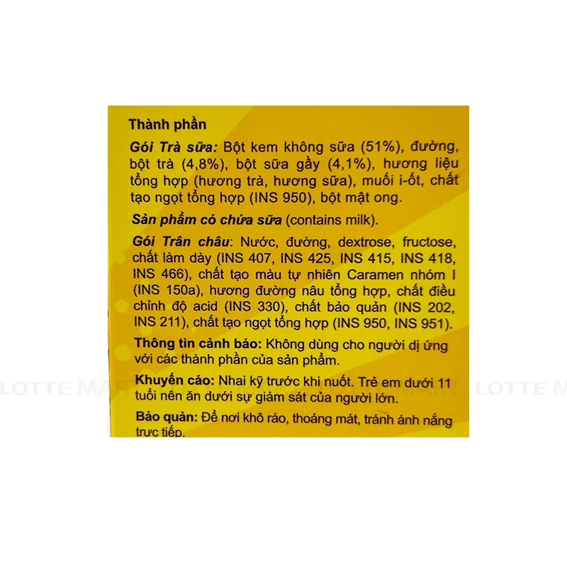 - Thành phần gói trà sữa: Bột kem không sữa (51%), đường, bột trà (4,8%), bột sữa gầy (4,1%), hương liệu tổng hợp (hương trà, hương sữa), muối i-ốt, chất tạo ngọt tổng hợp (INS 950), bột mật ong.