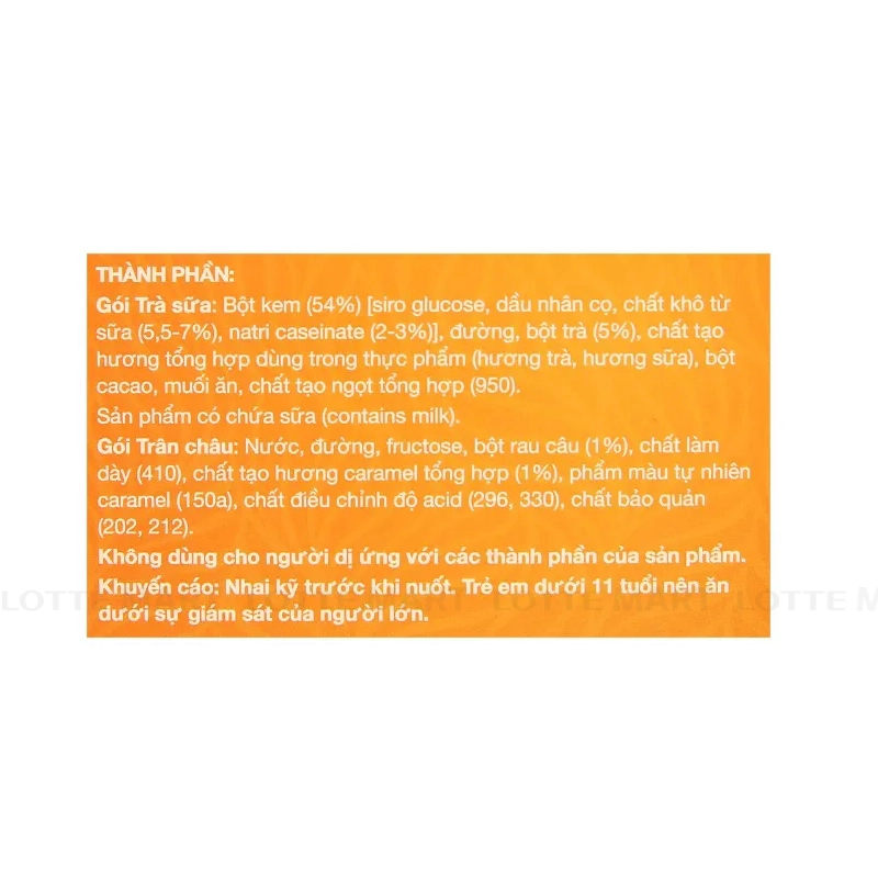 - Gói Trà sữa: Bột kem (54%), đường, bột trà (5%), chất tạo hương tổng hợp dùng trong thực phẩm, bột cacao, muối ăn, chất tạo ngọt tổng hợp (950).