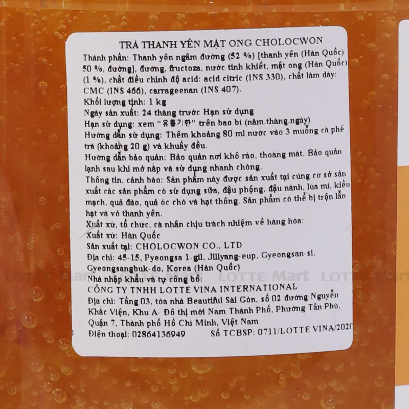 Hướng dẫn sử dụng: Pha trà chanh mật ong: Lấy 1-2 thìa mật ong chanh pha với 300 ml nước lọc mát hay ấm tùy sở thích. Có thể thêm một ít đá nếu bạn thích một cốc trà chanh mật ong mát lạnh. Dùng kèm với các món ăn khác: Có thể phết lên bánh mì để dùng trong bữa sáng. Dùng làm nước chấm thay thế khi ăn những món chấm đường hoặc chấm mật ong. Dùng để chữa ho: Đối với trẻ nhỏ: trẻ uống 2 muỗng mật ong chanh này vào buổi sáng và buổi tối. Đối với người lớn: mỗi ngày sử dụng 2 bữa, mỗi bữa 2 thìa mật ong chanh. Bạn có thể pha trà chanh mật ong như đã hướng dẫn ở trên để sử dụng. Thông tin nhà nhập khẩu, phân phối:
