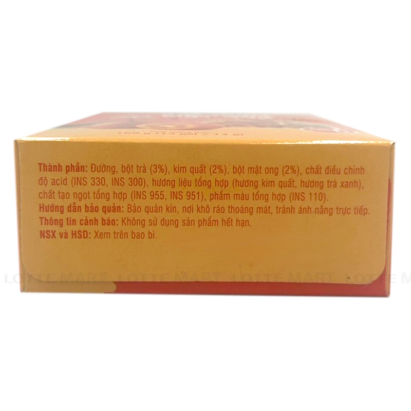 - Đường, bột trà (3%), kim quất (2%), bột mật ong (2%), chất điều chỉnh độ acid (INS 330, INS 300), hương liệu tổng hợp (hương kim quất, hương trà xanh), chất tạo ngọt tổng hợp (INS 955, INS 951), phẩm màu tổng hợp (INS 110).