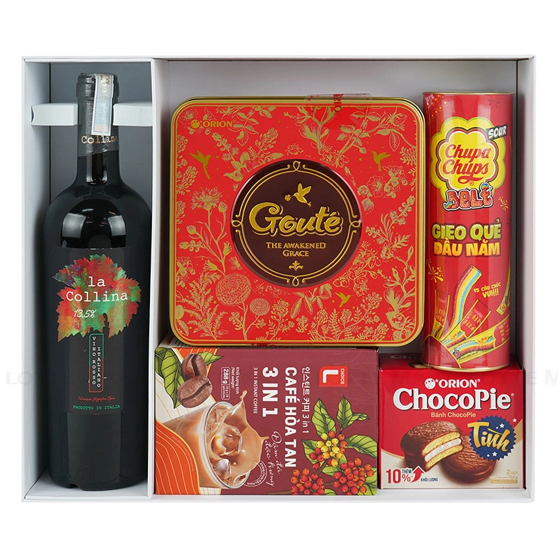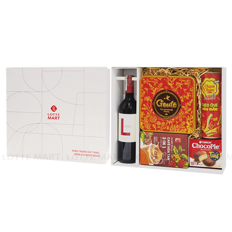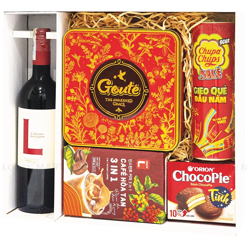 Điểm nhấn của hộp quà là Rượu Vang Đỏ L Cabernet Sauvignon 12.5% ABV Chai 750ml kết hợp cùng các món ăn nhẹ như Bánh Quy Gouté Solo Hộp 237.6G, Cà Phê Hòa Tan 3In1 Choice L Hộp 18 Gói 16G, Bánh Chocopie Hộp 72.6G và Kẹo Dẻo Chupa Chups Sour Belt Hộp 112G.