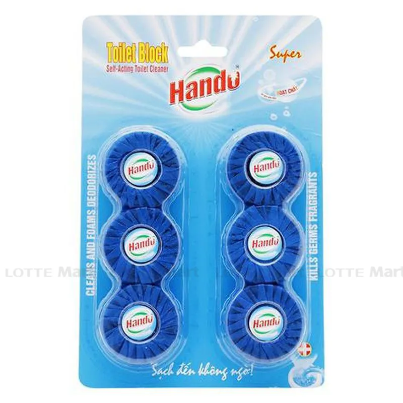 Viên Tẩy Và Làm Thơm Toilet Hando 6 Viên tự động tẩy sạch bồn toilet, khử mùi hôi, lưu lại mùi hương dễ chịu sau khi xả nước, khi hòa tan vào nước có màu xanh mát, diệt khuẩn nguy hại bằng công nghệ sinh học tiên tiến chống bắm cặn dính vào bồn cầu và không cần dùng tay cọ rửa.