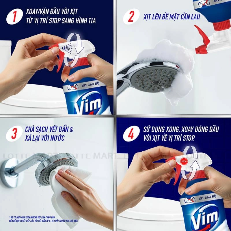 Xịt lên bề mặt cần làm sạch và cần vệ sinh như vòi sen, bồn rửa, hoặc gạch men, có thể dùng bàn chải hoặc khăn để chà sạch vết bẩn, sau đó xả lại bằng nước sạch.