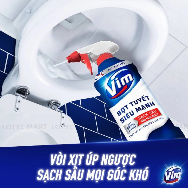 Bọt Tuyết Siêu Mạnh Tẩy Bồn Cầu và Nhà Vệ Sinh Vim giúp thẩm thấu sâu và bám lâu trên bề mặt để đánh bay các vết bẩn cứng đầu, vi khuẩn và mùi hôi.