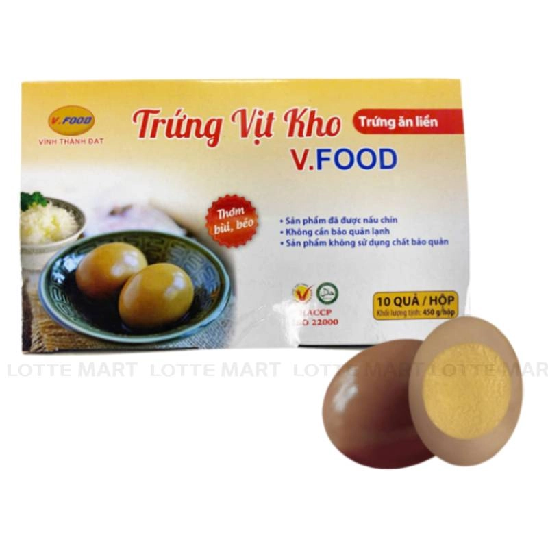 Trứng Vịt Kho V.Food là sản phẩm thực phẩm tiện lợi đã được chế biến sẵn, mang đến món trứng kho hoàn chỉnh.