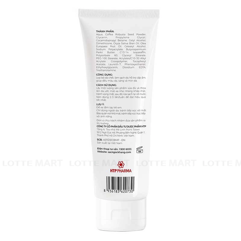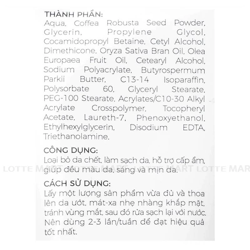 - Thành phần chiết xuất Cà phê Robusta xay nhuyễn, dầu Cám Gạo, Dầu Oliu.