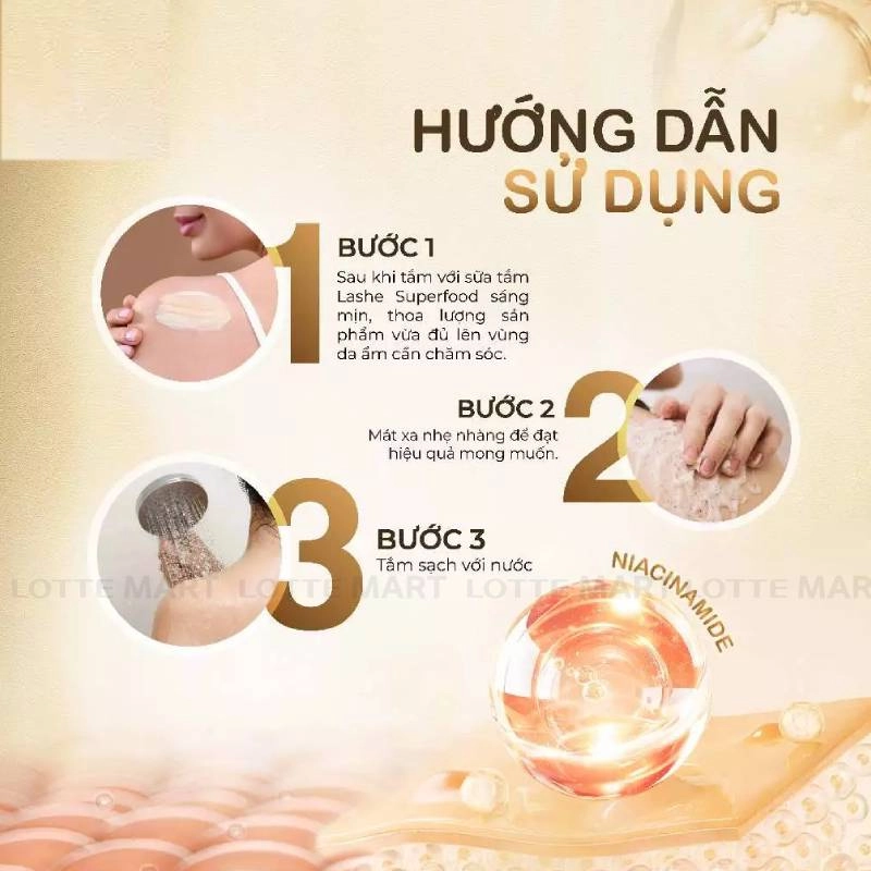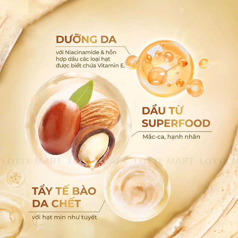 Sản phẩm chứa công thức 3X kết hợp Niacinamide và các loại dầu thực vật từ Superfood (hạnh nhân, mắc-ca) giàu vitamin E giúp da sáng khỏe, mịn màng.