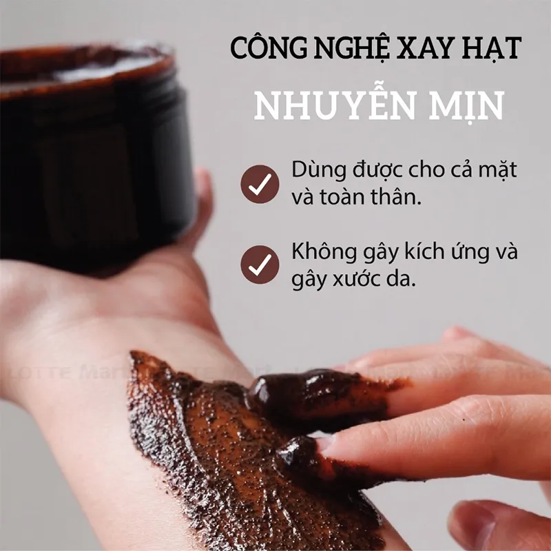- Thành phần cà phê hạt mịn Robusta và đường nâu giúp lấy đi các lớp sừng, tế bào chết đồng thời kích thích sản sinh tế bào mới giúp da mịn màng và tươi sáng.