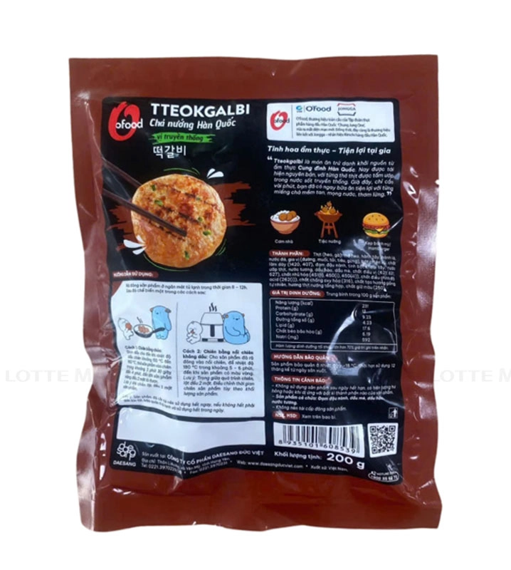 - Tteokgalbi Chả Nướng Hàn Quốc O'Food Vị Truyền Thống là sản phẩm mang đậm phong cách ẩm thực Hàn Quốc, tái hiện món tteokgalbi truyền thống nổi tiếng với từng thớ thịt được tẩm ướp trong nước sốt truyền thống, mang đến hương vị đậm đà và hài hòa.