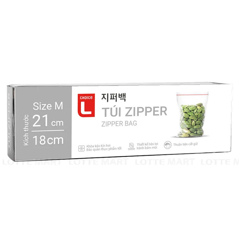 - Túi Zipper Choice L Size M 18 x 21cm 30 Túi có khả năng chịu được nhiệt độ cao, giúp bảo quản thực phẩm tốt, an toàn cho người sử dụng. Thiết kế với đường zip trên miệng túi rất thuận tiện để cất giữ thực phẩm bên trong mà không cần phải qua một công đoạn trung gian như buộc, thắt miệng túi lại.