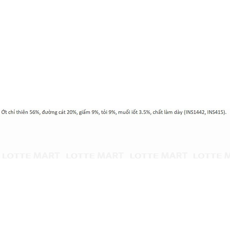 - Ớt chỉ thiên 56%, đường cát 20%, giấm 9%, tỏi 9%, muối iốt 3.5%, chất làm dày (INS1442, INS415).