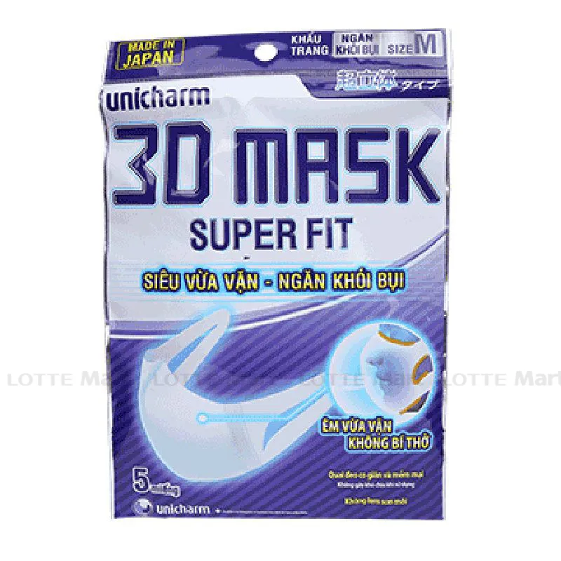 Khẩu Trang Unicharm 3D Mask Superfit Ngăn Khói Bụi Gói 5 Cái thiết kế 3D thông minh cho phép sản phẩm ôm vừa vặn đường cong khuôn mặt, cho cảm giác thoải mái, dễ chịu, không gây bí thở mà vẫn đảm bảo giữ nhiệt và độ ẩm cho mũi và họng vào mùa đông.